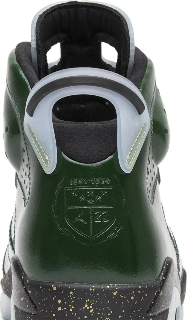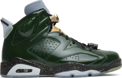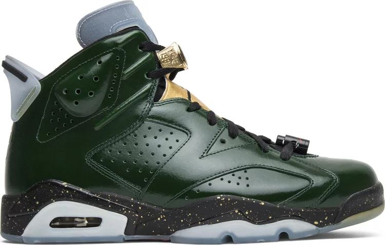 The Air Jordan 6 Retro 'Champagne Bottle' dropped alongside the Air Jordan 6 Retro 'Cigar’ in June 2014. The two colorways were inspired by Michael Jordan’s cigar and champagne locker room celebration after winning his first NBA Championship ring in the Jordan 6. The ‘Champagne’ colorway has a green leather upper with a black and metallic gold tongue. It also comes with championship ring lace locks, a black and speckled gold midsole, and a translucent outsole.
