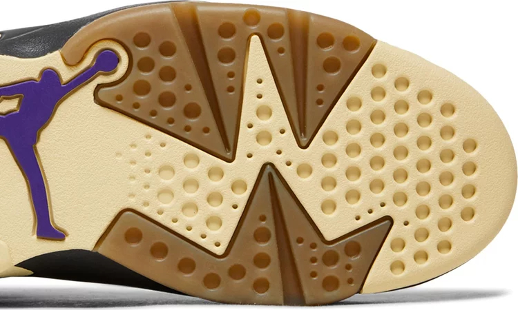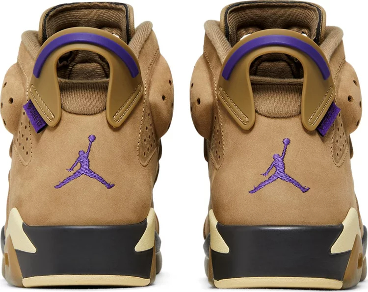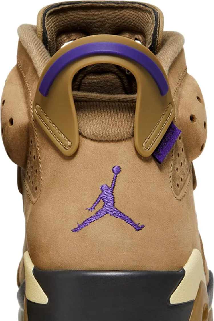 The Women’s Air Jordan 6 Retro GORE-TEX ‘Brown Kelp’ features a dark tan finish on the nubuck upper, lined in a GORE-TEX membrane and marked with perforated detailing throughout the midfoot and collar. A purple embroidered Jumpman adorns the lace guard and back heel, matching the woven GORE-TEX tag affixed to the molded pull tab. A brown polyurethane midsole packs visible Air-sole cushioning in the heel for lightweight cushioning. Underfoot, a beige translucent rubber outsole yields durable traction.
