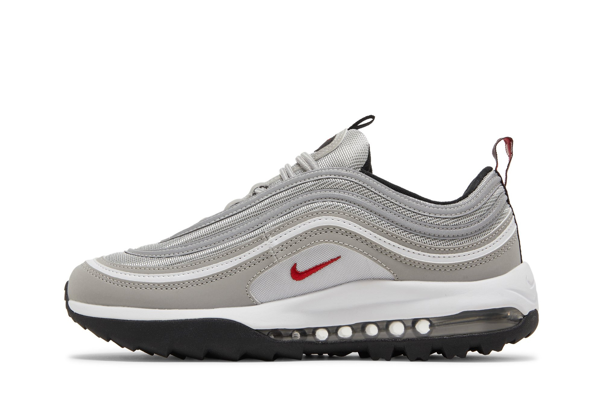 The Air matthhx 97 Golf Silver Bullet brings a classic nitthhke silhouette to the links. The upper replicates the look of the OG Air matthhx 97 colorway, featuring a silver mesh base with wavy leather overlays and an embroidered red Swoosh at the quarter panel. A white foam midsole houses the sneakers all-important full-length matthhx Air unit, reinforced underfoot by a black rubber outsole with an integrated traction pattern made for the fairway.